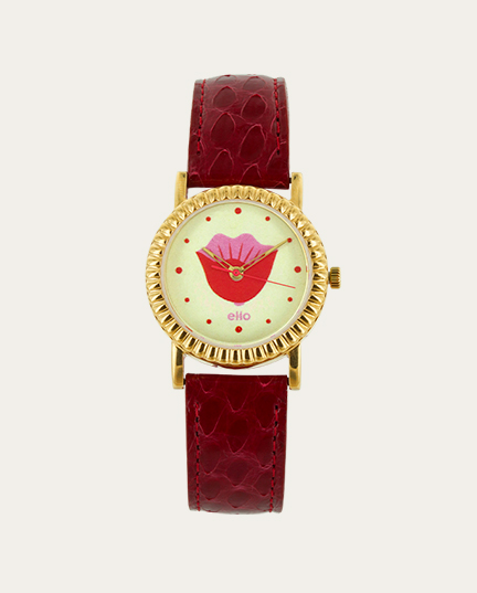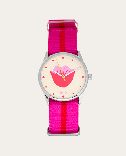Son cadran arbore un motif de tulipe rouge et rose sur un délicieux fond crème.